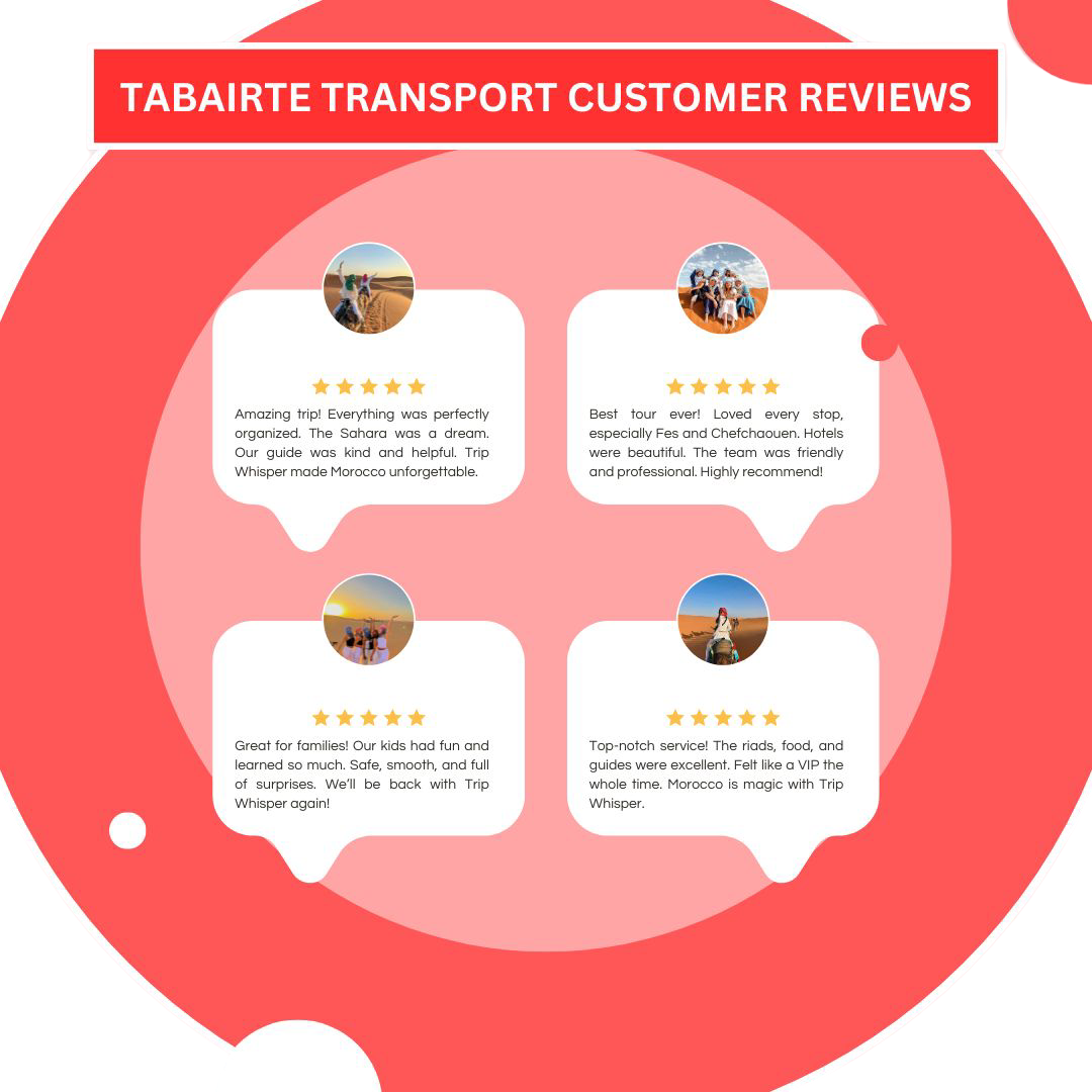 As a licensed tourist transportation agency, Tabairte Transport offers safe, reliable, and personalized travel for every type of visitor. From airport transfers to desert expeditions, we ensure comfort, professionalism, and authentic Moroccan hospitality.